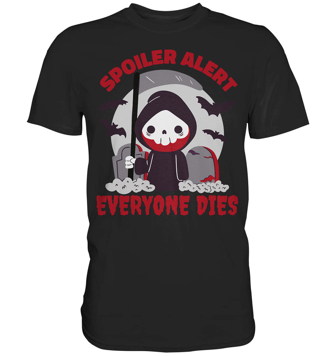 Einzigartiges und lustiges Kleidungsstück, das in jeder Situation für Aufsehen sorgt. Mit seinem auffälligen Design ist es perfekt geeignet, um im Büro, im Kino oder sogar zu Halloween getragen zu werden. Der Hauptfokus des Designs liegt auf einem düsteren Reaper, der von einem Spruch begleitet wird, der die Botschaft "Spoiler Alarm - everyone dies" vermittelt. Diese Kombination aus Humor und morbider Ästhetik macht das T-Shirt zu einem idealen Geschenk für antisoziale Kollegen und Kinonerds. Egal ob du es im Büro trägst, um deine Kollegen zum Lachen zu bringen, oder es als Statement-Piece bei einem Kinobesuch verwendest, "Spoiler Alarm - everyone dies" ist definitiv ein Blickfang. Zeige deine Liebe für schaurige Filme und schwarzen Humor mit diesem einzigartigen Kleidungsstück. Bestelle noch heute das "Spoiler Alarm - everyone dies" Reaper Motiv und sei bereit, überall für Gesprächsstoff zu sorgen. Mach dich auf neidische Blicke gefasst!